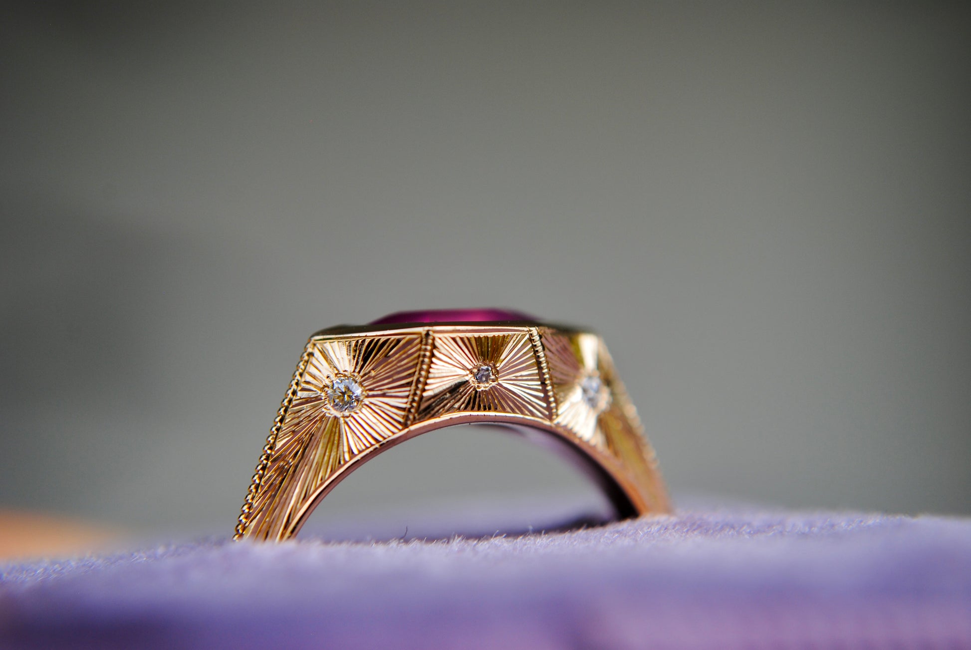 2.05 carat pink hexagon opalescent sapphire engraved signet