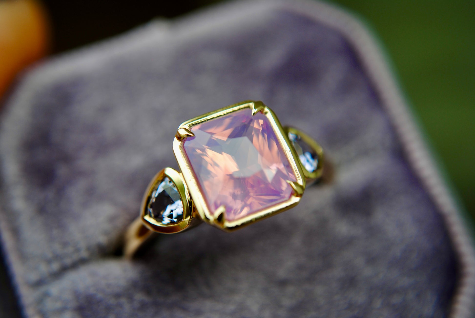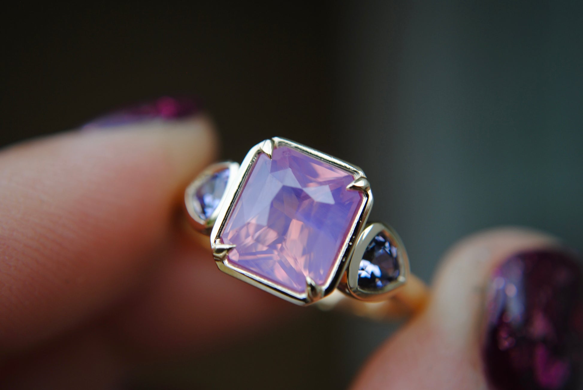 3.05 carat custom sapphire ring with 4mm light purple sapphire trillion in 14k yellow gold size 9