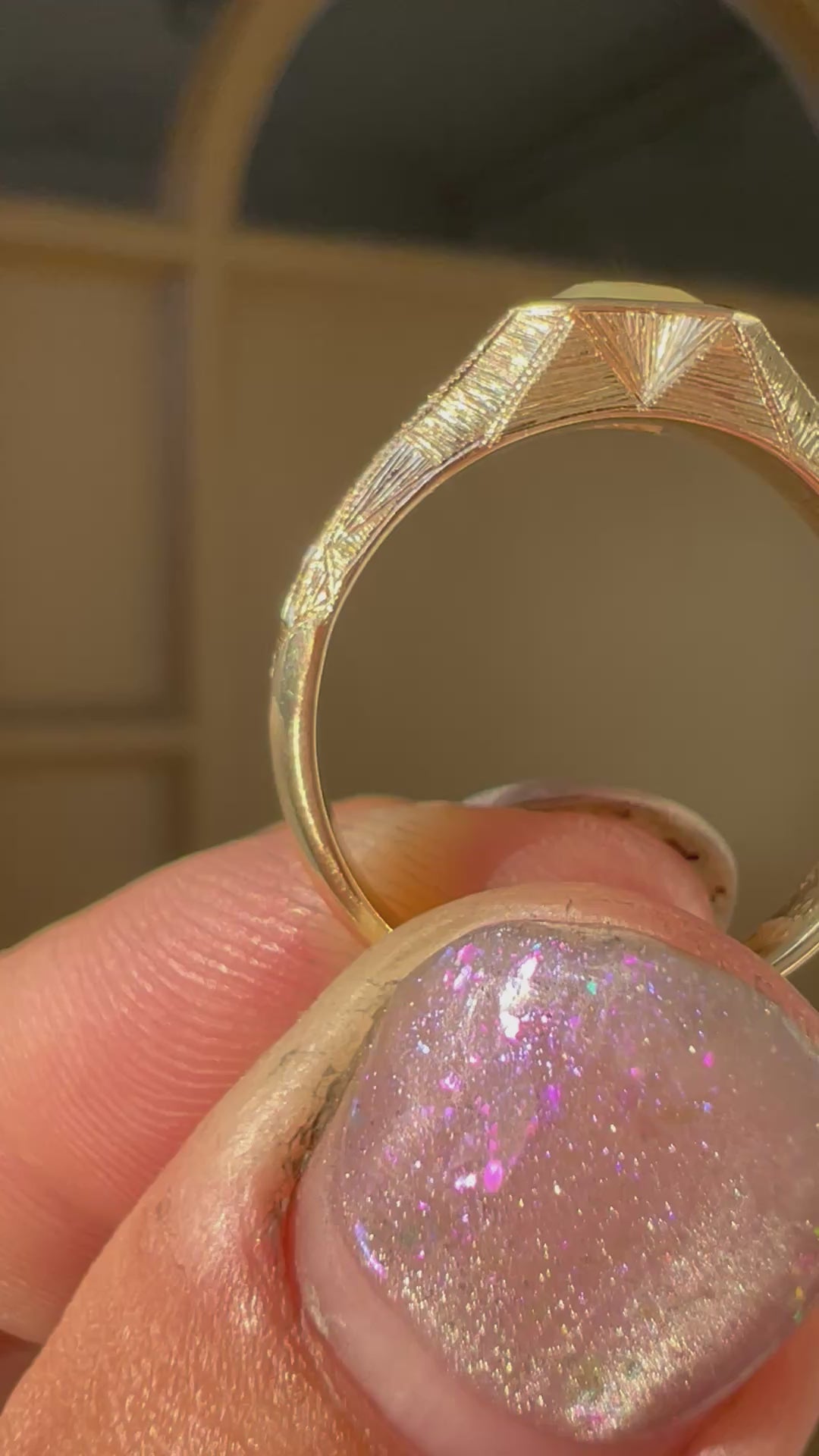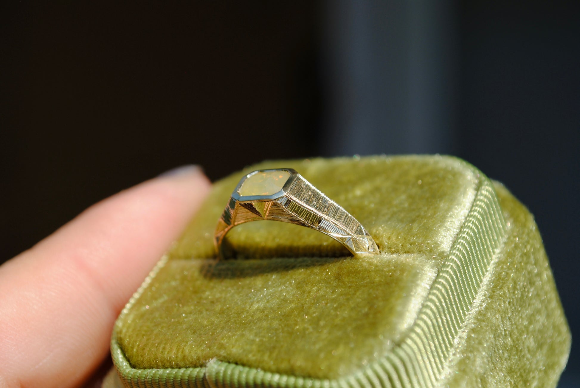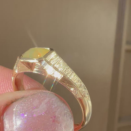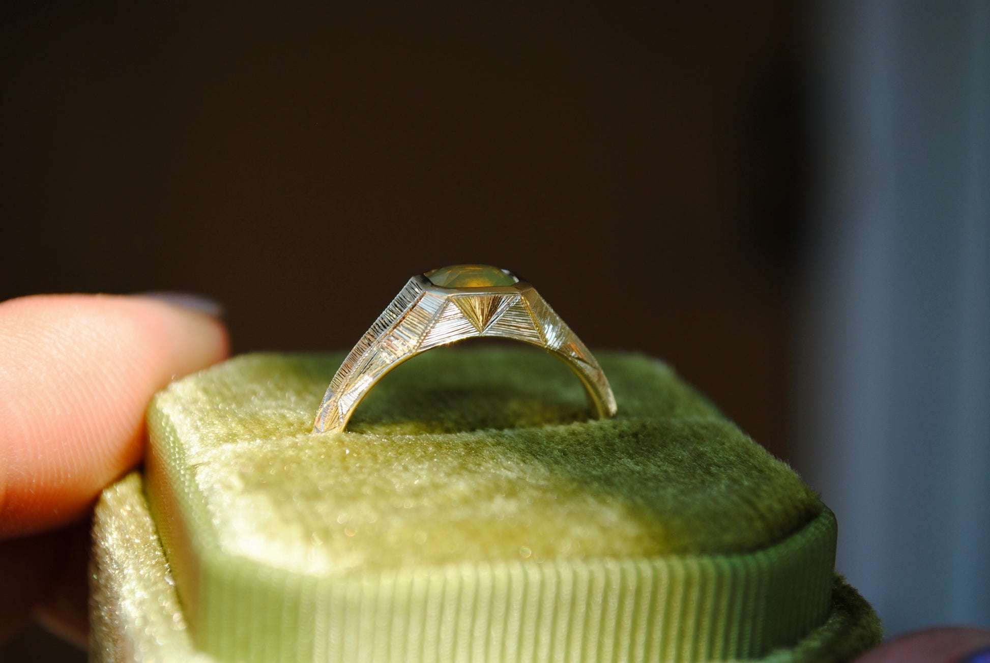 1.05 carat natural opalescent yellow sapphire from Sri Lanka at the center of this paneled and deeply detailed engraved ring