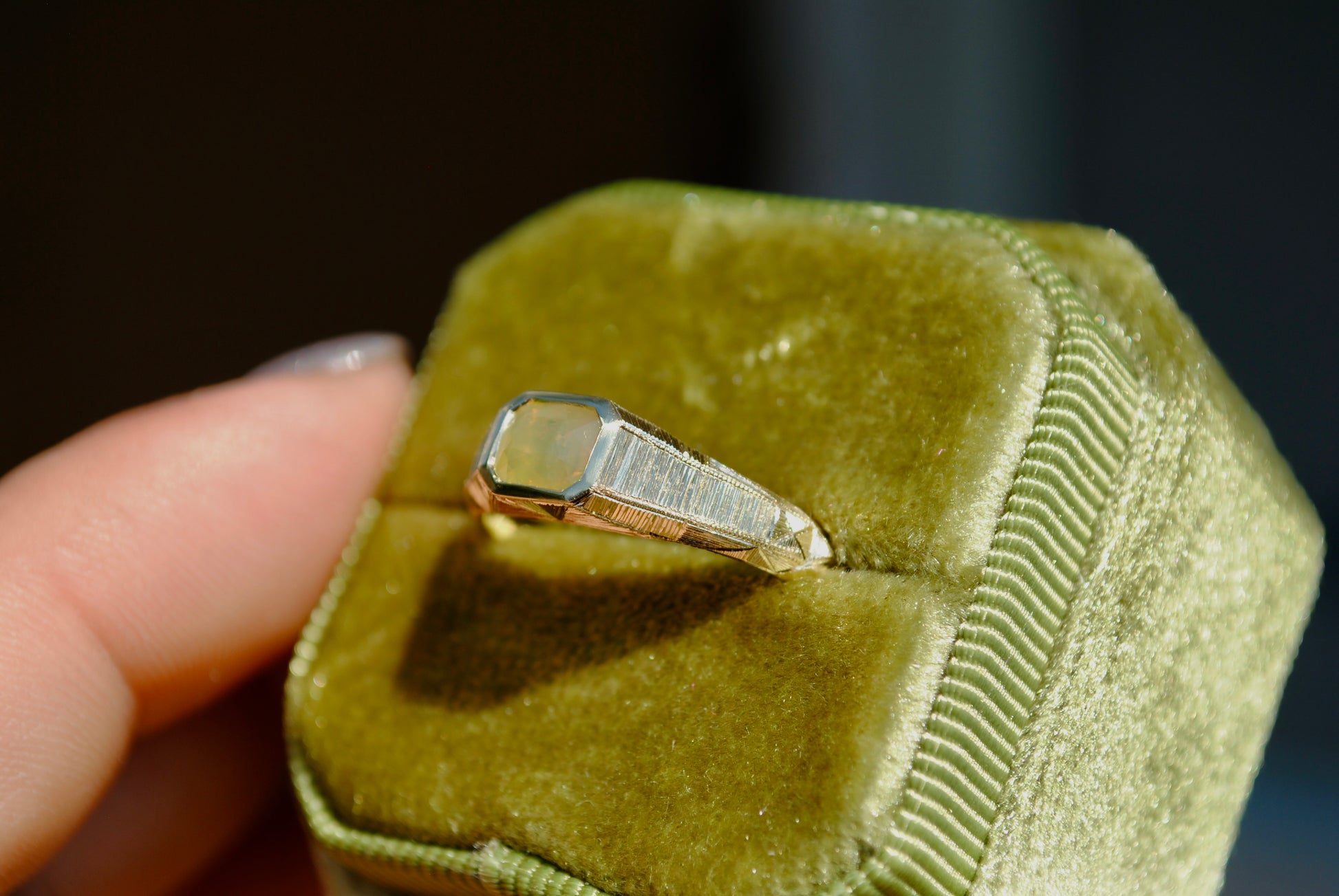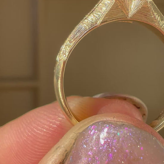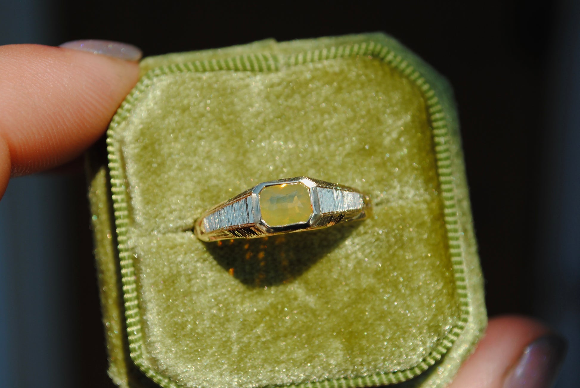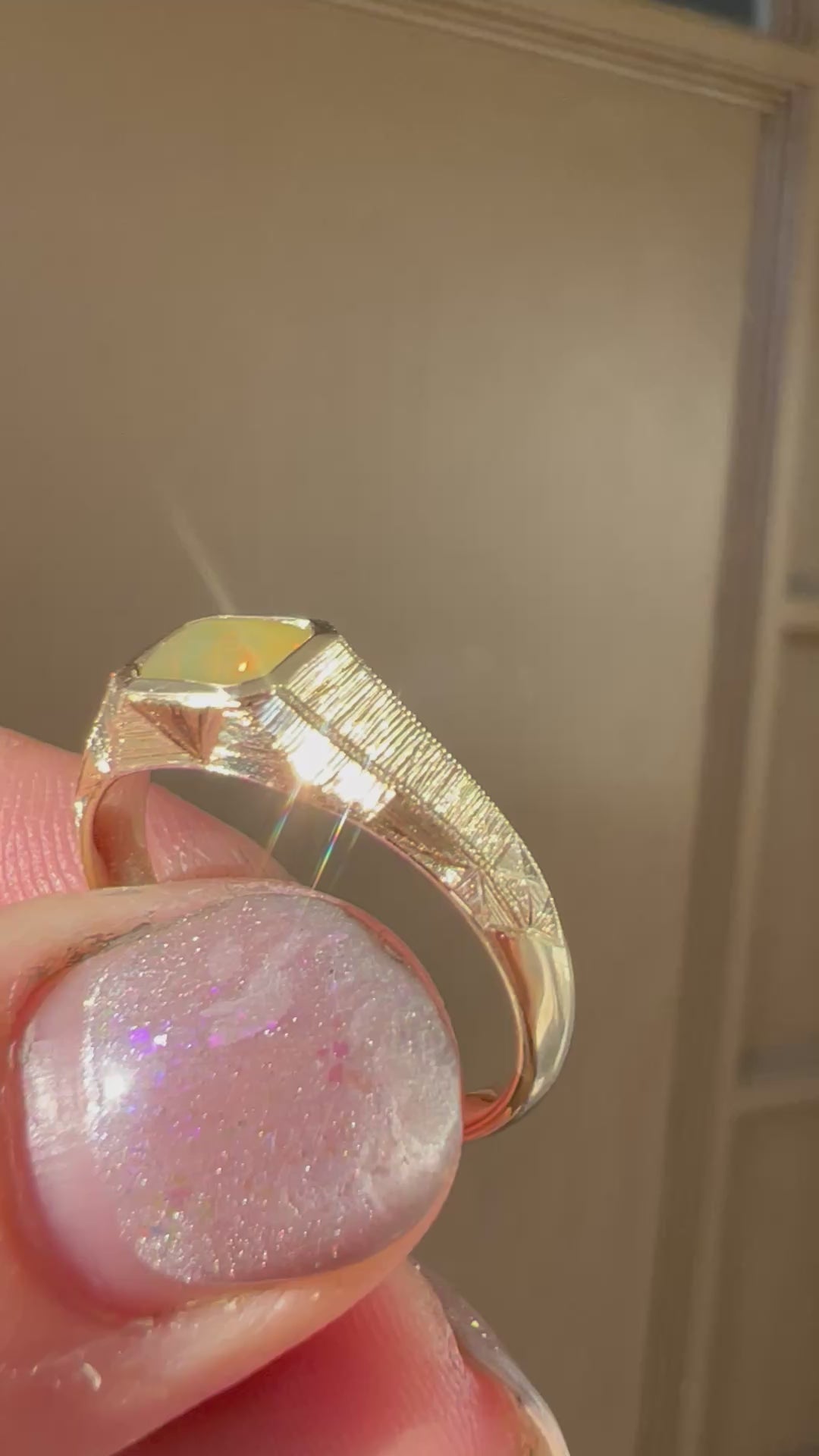 1.05 carat natural opalescent yellow sapphire from Sri Lanka at the center of this paneled and deeply detailed engraved ring