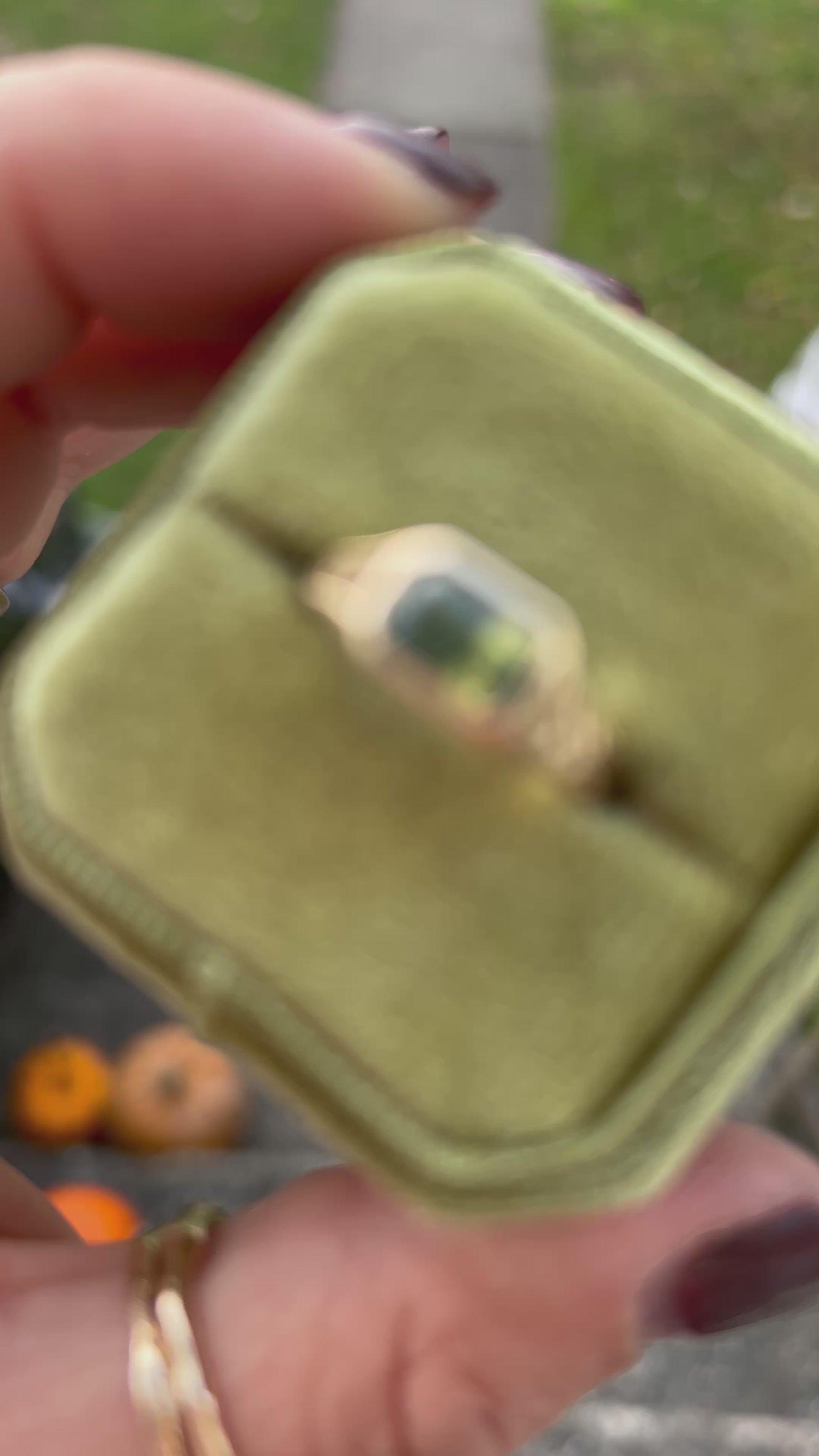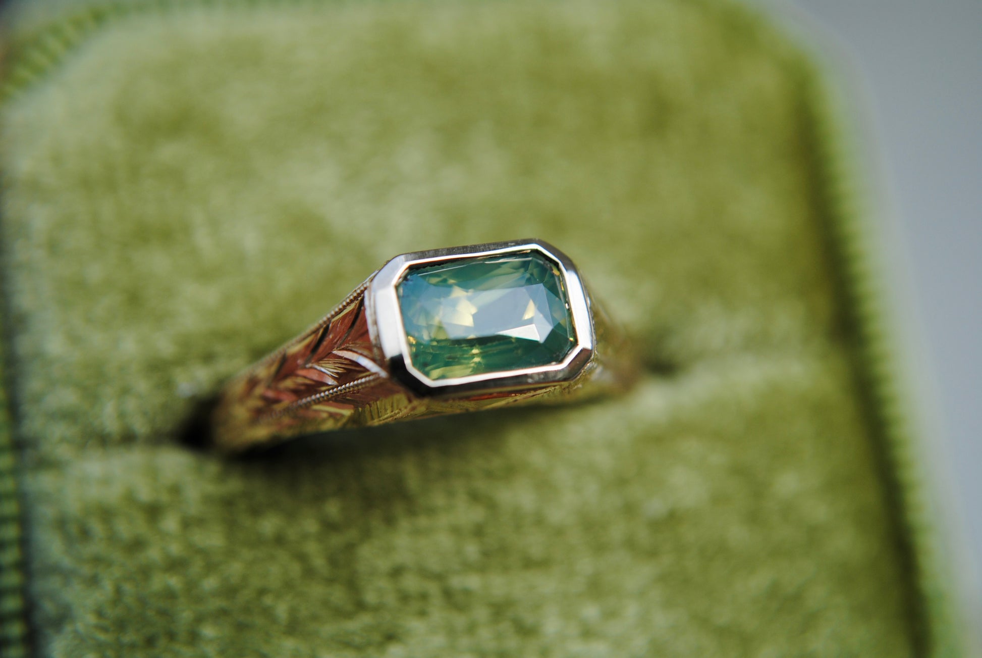 1.61 carat natural bright green opalescent sapphire (natural, unheated) at the center of this deeply detailed engraved ring