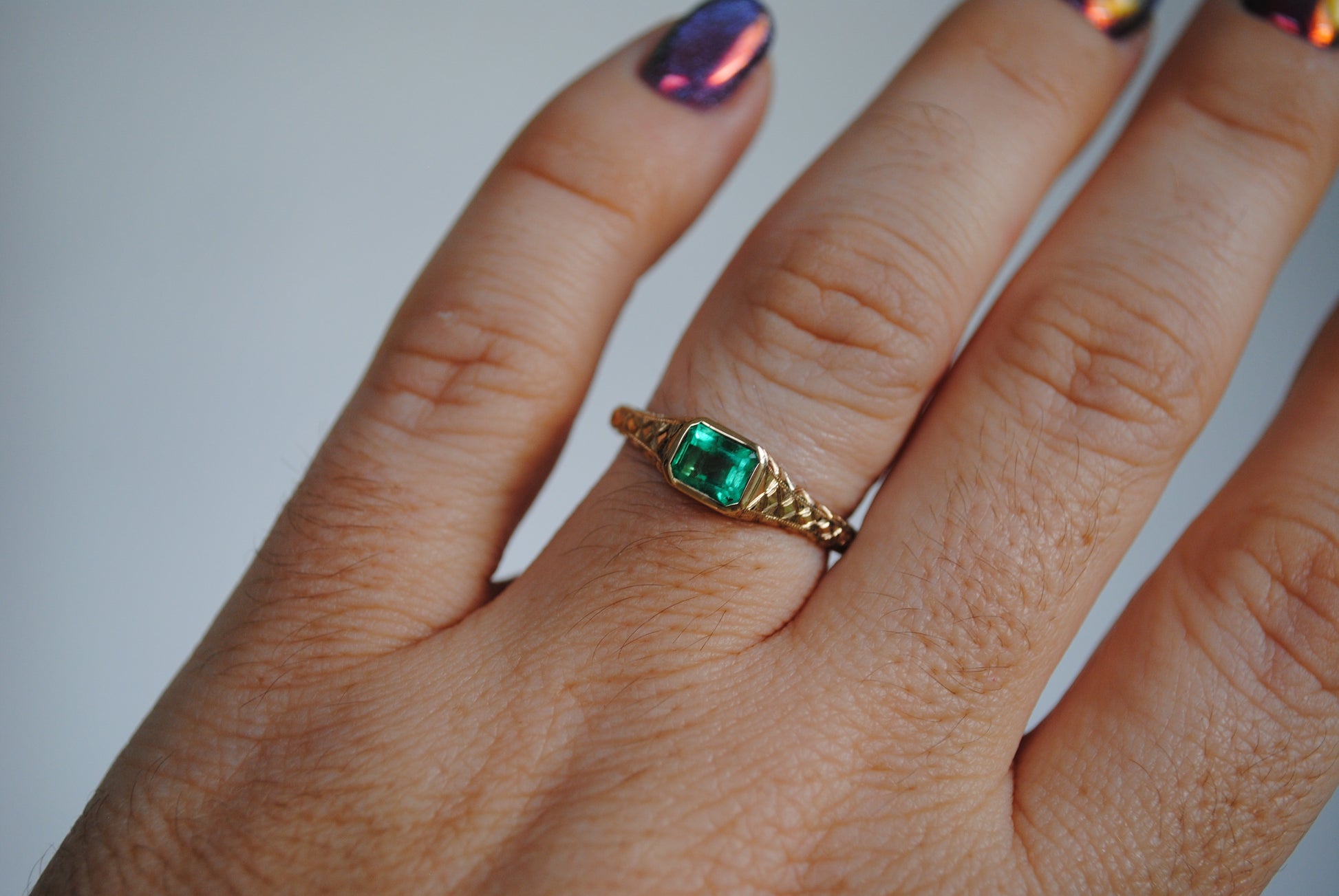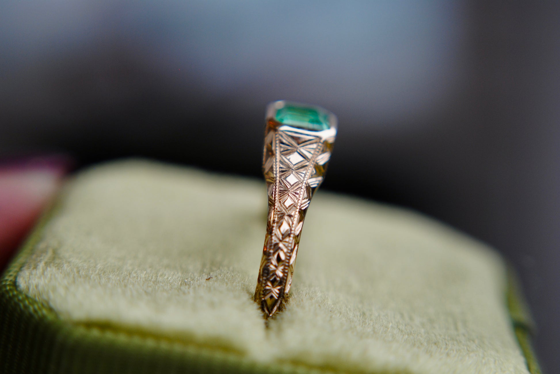 .7 carat natural gorgeous green emerald at the center of this deeply detailed engraved ring